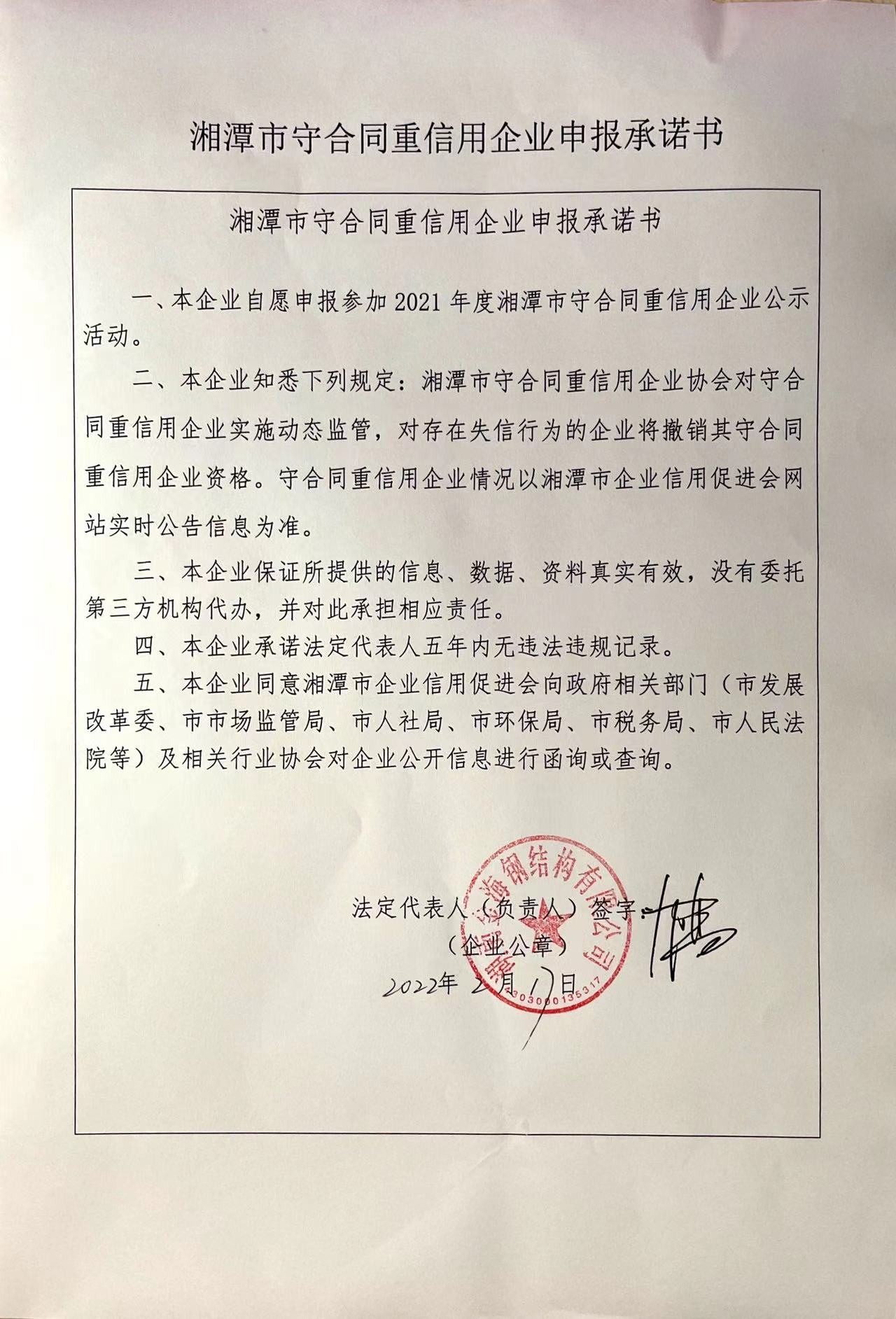 本企業根據《湘潭市守合同重信用企業申報規定》等編制 2021 年度企業信用報告書,并保證本報告書內容真實、準確、完整。