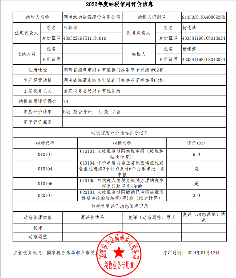 企業納稅信用等級報告: