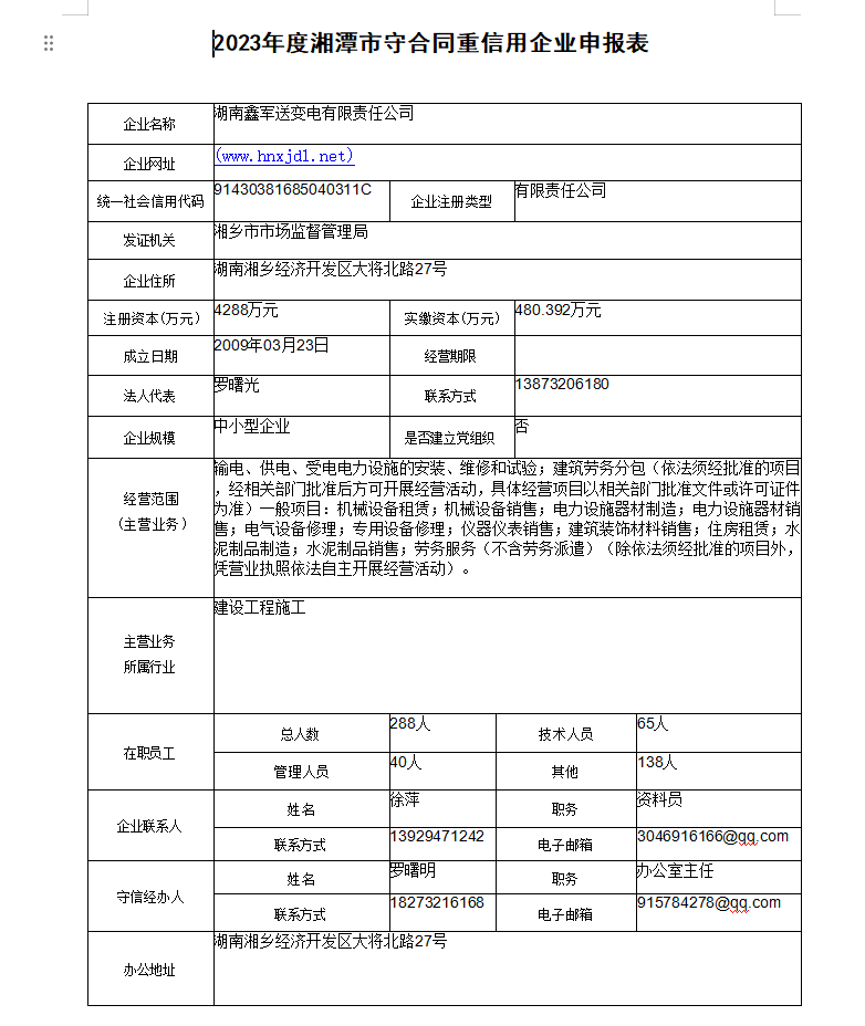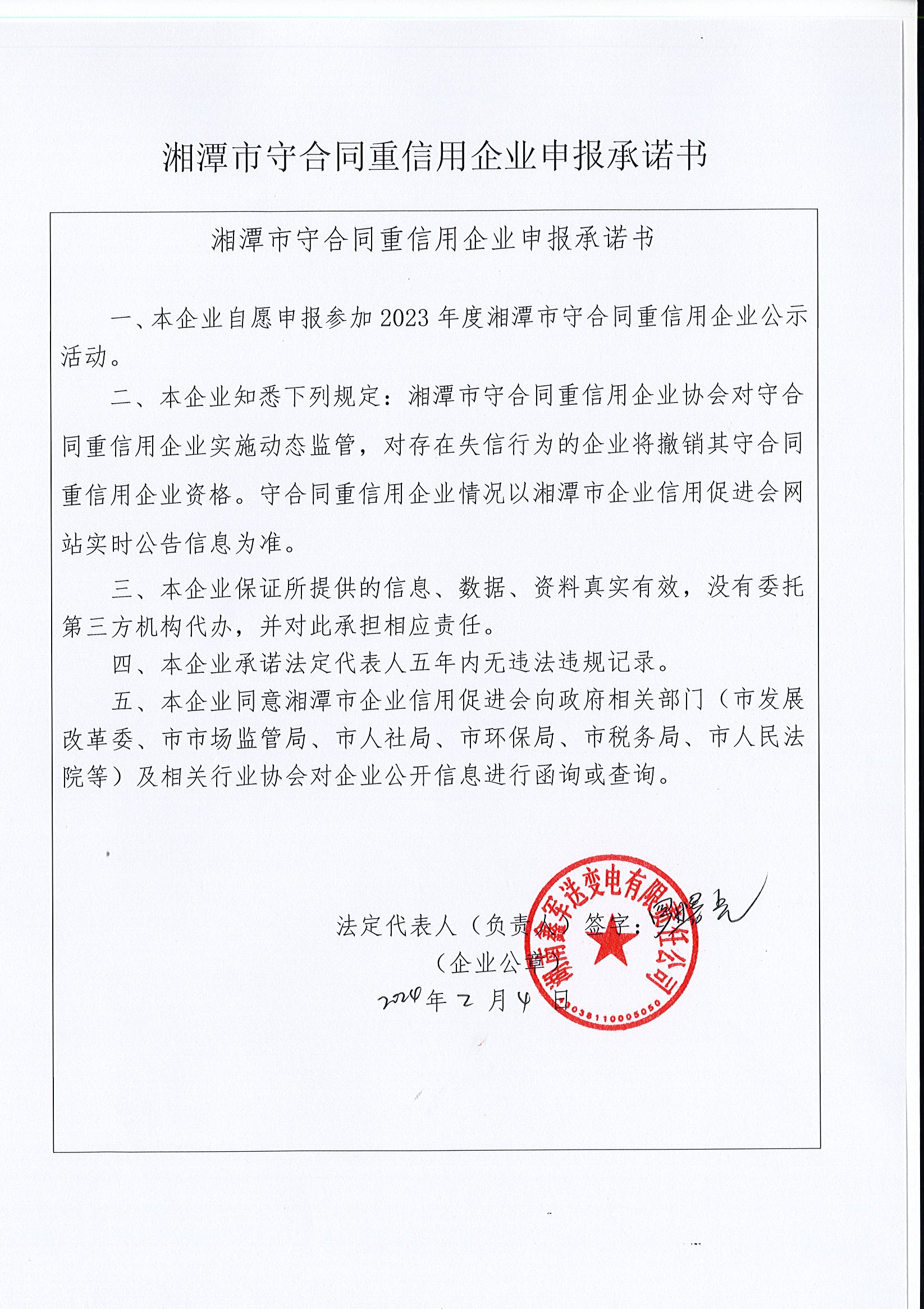 本企業根據《湘潭市守合同重信用企業申報規定》等編制 2023 年度企業信用報告書,并保證本報告書內容真實、準確、完整。
