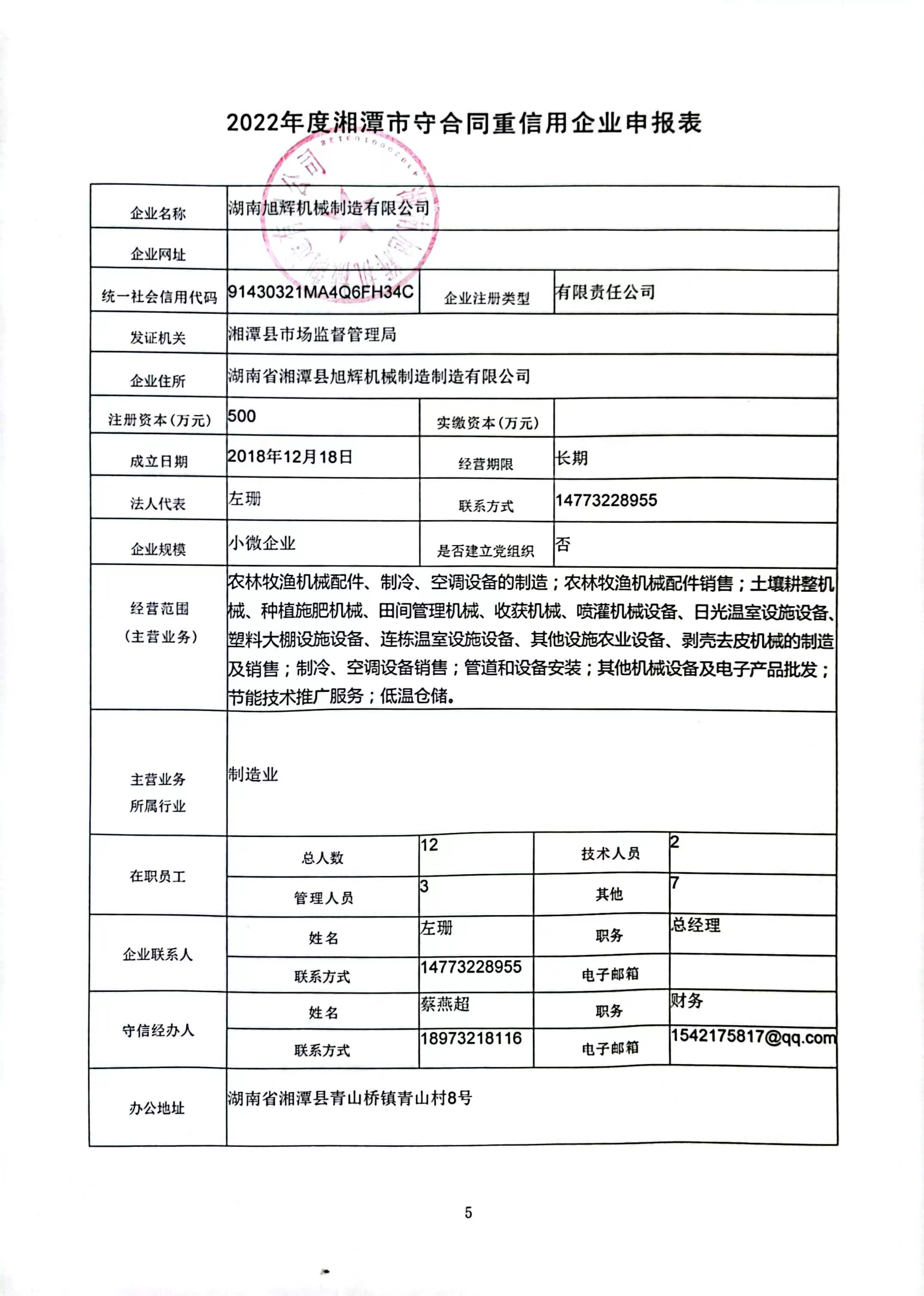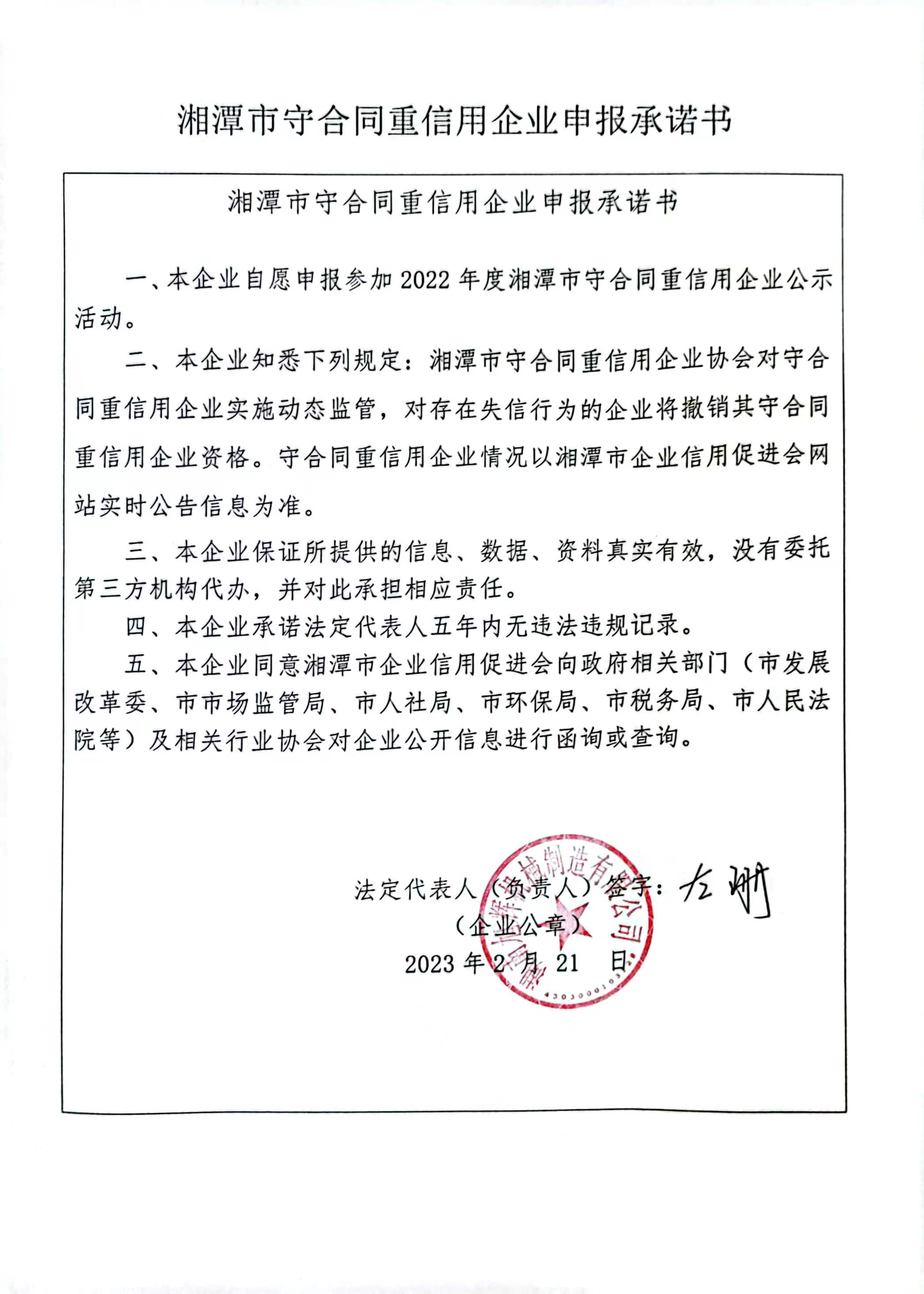 本企業根據《湘潭市守合同重信用企業申報規定》等編制 2022 年度企業信用報告書,并保證本報告書內容真實、準確、完整。