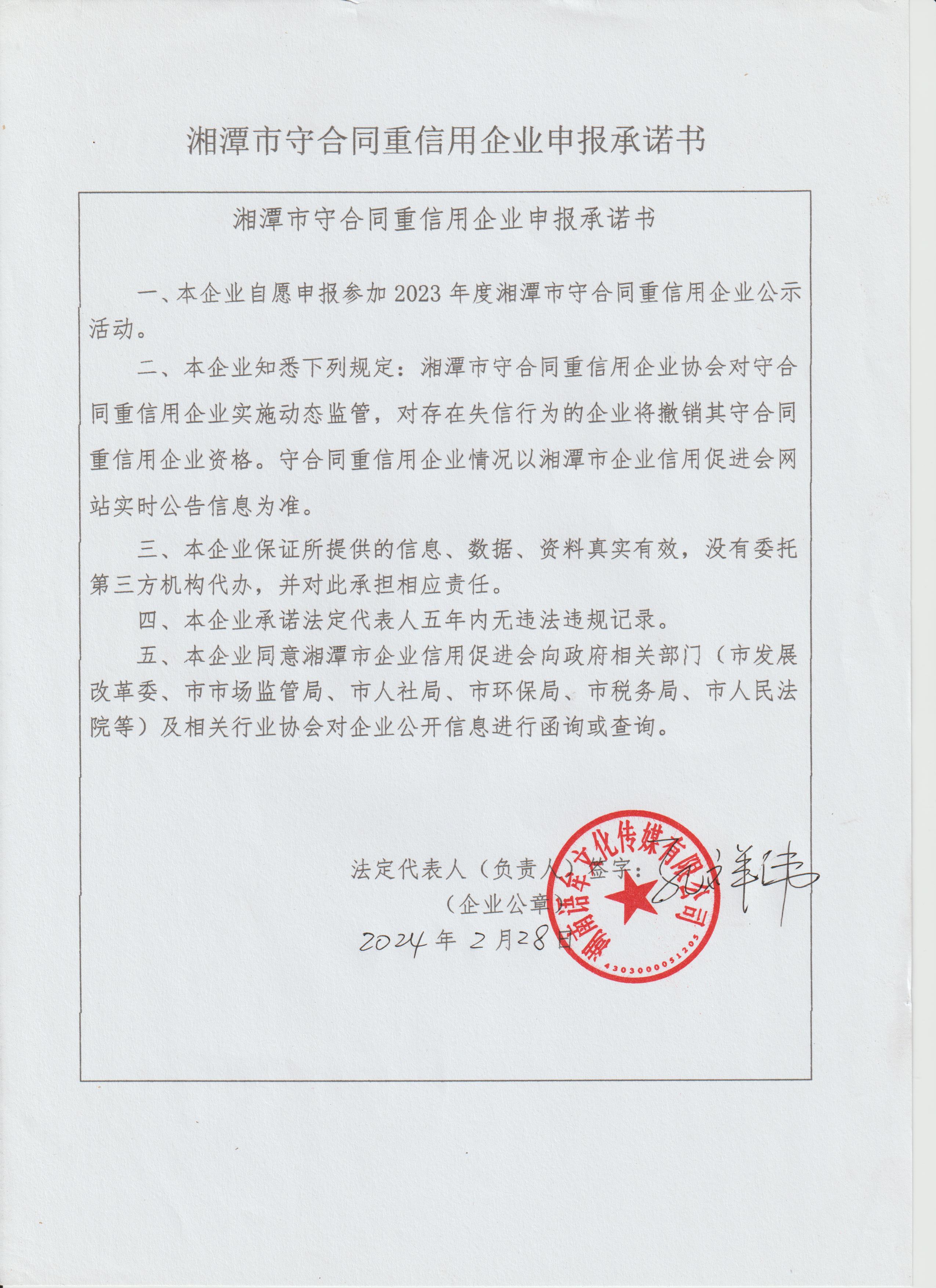 本企業根據《湘潭市守合同重信用企業申報規定》等編制 2023 年度企業信用報告書,并保證本報告書內容真實、準確、完整。