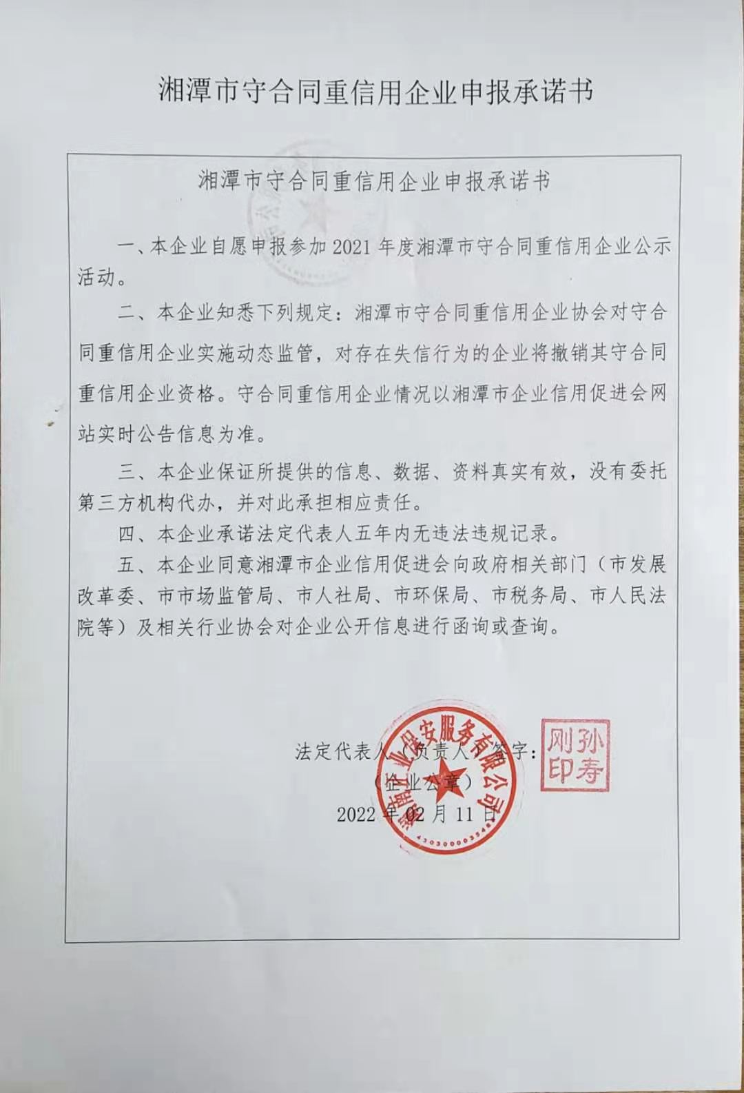 本企業根據《湘潭市守合同重信用企業申報規定》等編制 2021年度 年度企業信用報告書,并保證本報告書內容真實、準確、完整。