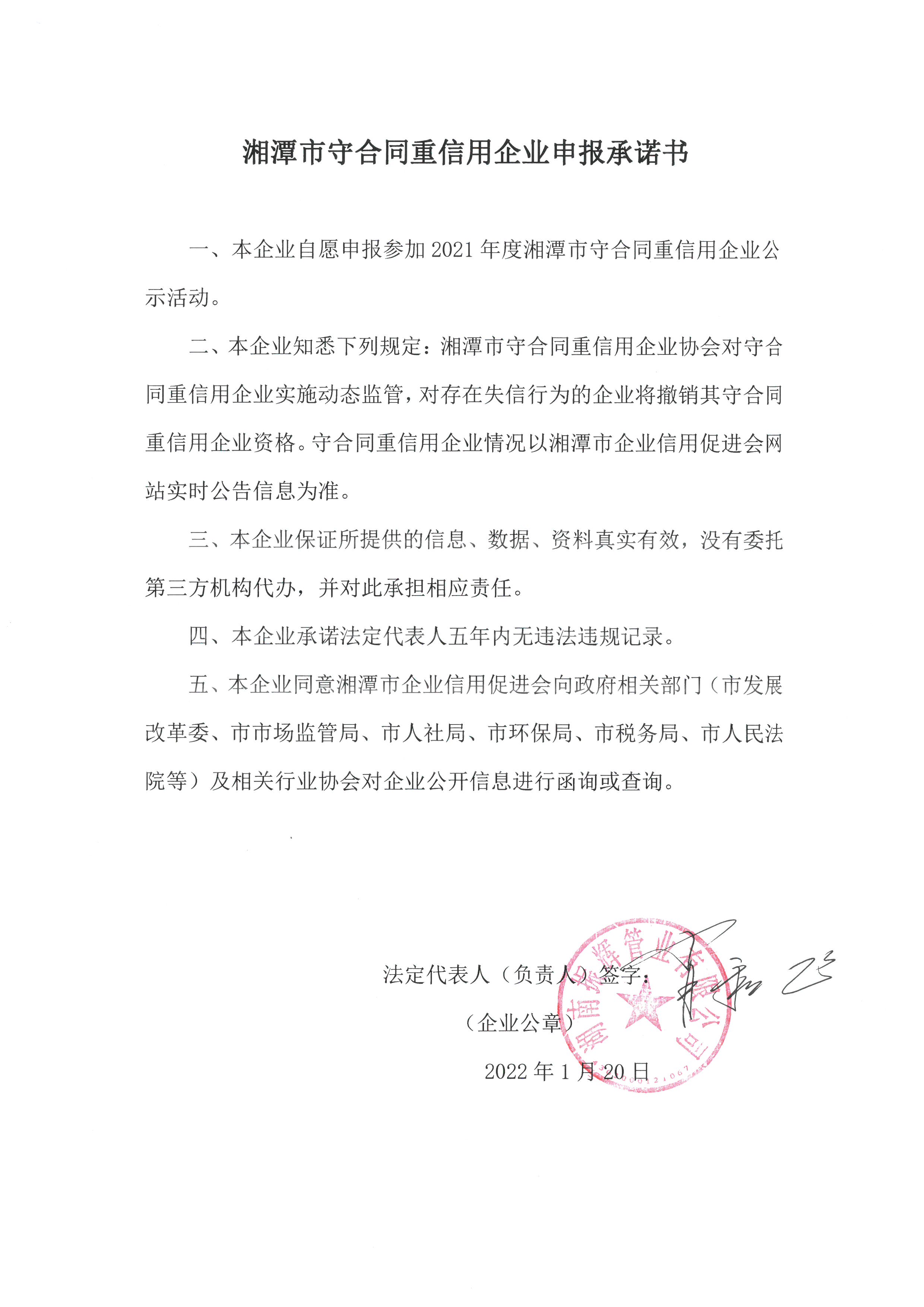 本企業根據《湘潭市守合同重信用企業申報規定》等編制 2021 年度企業信用報告書,并保證本報告書內容真實、準確、完整。
