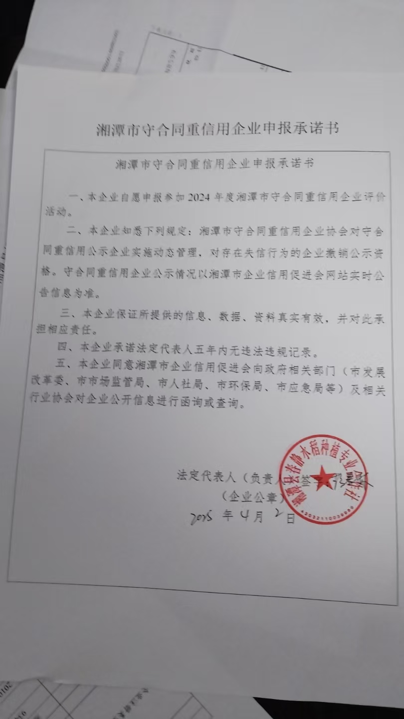 本企業根據《湘潭市守合同重信用企業申報規定》等編制 2024 年度企業信用報告書,并保證本報告書內容真實、準確、完整。