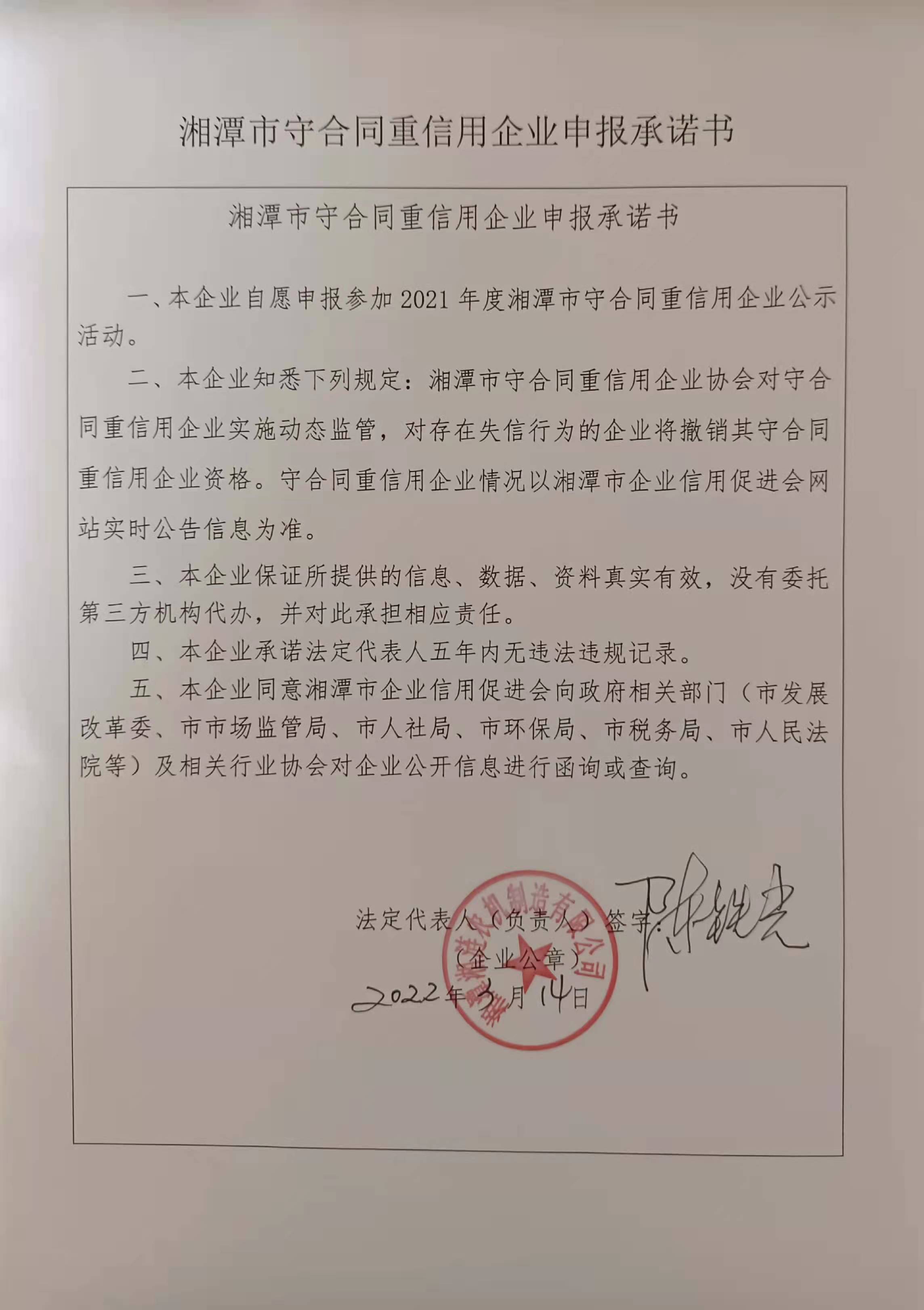 本企業根據《湘潭市守合同重信用企業申報規定》等編制 2021 年度企業信用報告書,并保證本報告書內容真實、準確、完整。